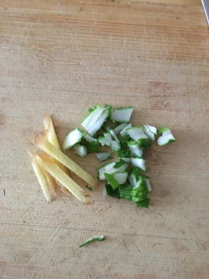 长茄子洗净去蒂,切成大小适中的滚刀块,放入适用于微波炉的盘子中,移入微波炉中,高火加热2 分钟,至茄子块变软取出。