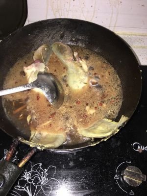 大火烧热炒锅中的油,放入大蒜瓣、老姜片煸炒出香味,放入切好的鲶鱼段,煸至鱼块变成金黄色。