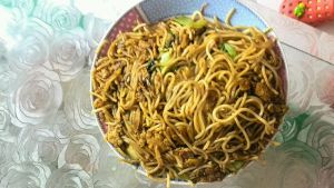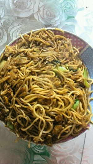 余油再热,葱姜蒜爆香,放油菜,孜然粉翻炒,倒酱油,然后放入蒸好的面条,加排骨汤或鸡汤,高汤都可以,没有放水也行。