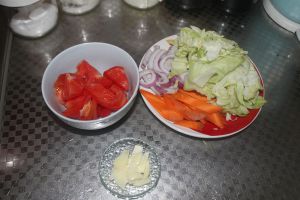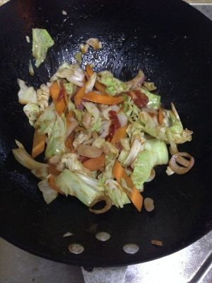 等西红柿炒熟炒透以后,应该是粘粘糯糯的汤时,加入洋葱,胡萝卜,圆白菜翻炒。