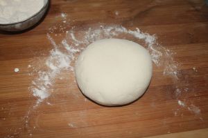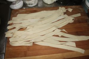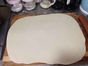 面团擀成手擀面那么厚的薄饼,大概2毫米吧。喜欢吃劲道的,可以适当擀,软一点儿的擀薄点。