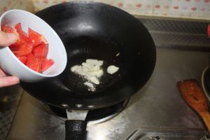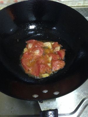 这时锅中倒油,油热后加入蒜片,爆出香味,加入西红柿,盖上盖子焖一会儿,等西红柿焖出红色粘稠的汤汁。