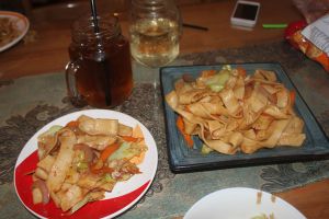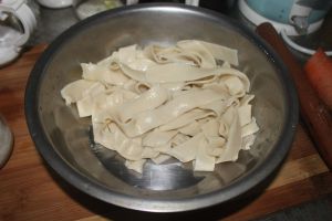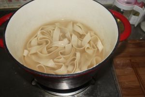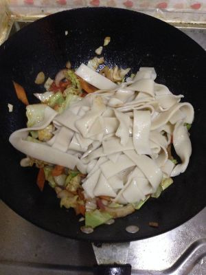 此时加入事先煮好的宽面条,然后再迅速的翻炒。加适量的盐和糖调味,就可以出锅了。