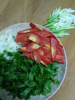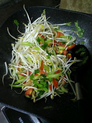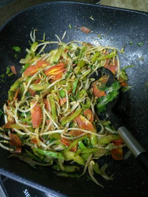 胡萝卜、洋葱、蒜苗改刀切好备用。豆芽洗净。