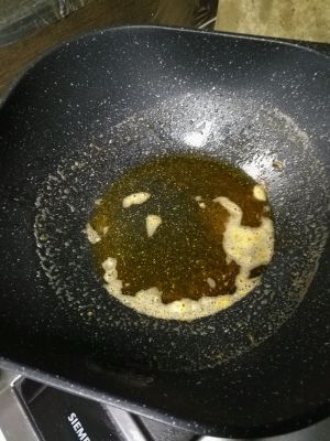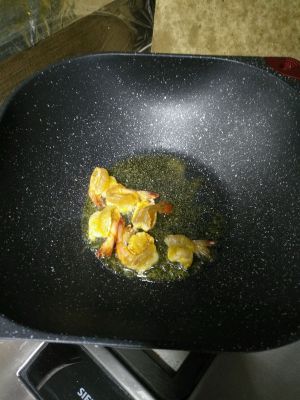 将炒好的虾肉盛出,放入虾头煸炒出虾油,盛出备用。