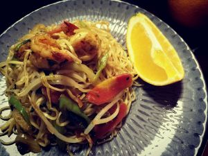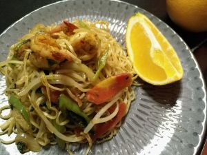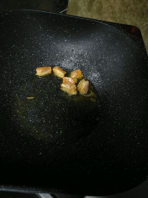 翻炒断生,放入之前的虾肉,加一点咖喱粉,适量孜然,最后放盐调味,盐要略重一点,因为后面放的面是没味儿的。