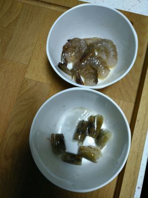 北极虾剪剑去头、去虾线,虾身去皮开背。虾肉放酒和咖喱粉腌制15分钟。