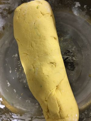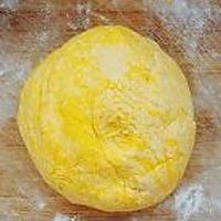 将蒸熟的南瓜去了多余的水,再加糖和糯米粉一起搓成粉团。