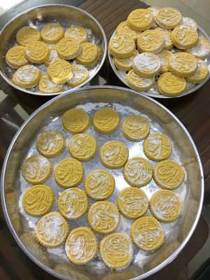 捏少许粉团用双手搓成小丸子,放入模具压平,印出花样。