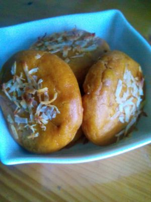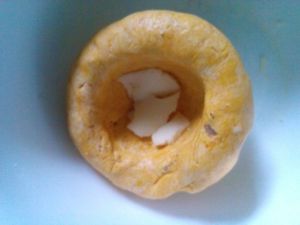 蒸熟的南瓜很软的。随便找个大勺子压压就化了加入面粉 白糖。搅拌一起.. 看不是很软了。开始做造型。你可以找个盖子... 这样可能稍稍有型点。我就这么干的.. 哈哈