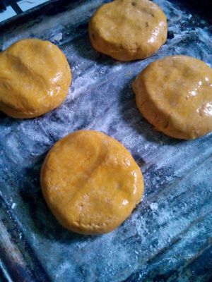 搓圆,压扁,浑身抹油,排上烤盘。烤箱预热200度。