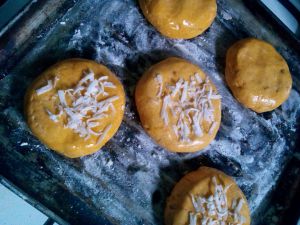 椰丝稍微按压在南瓜表面。椰丝比较干,容易烤焦,最好用锡纸覆盖烤。