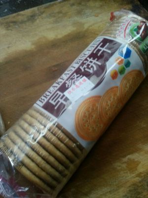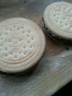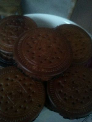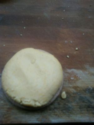 先把面团揉圆拍成饼状!尽量薄一点我的太厚了!放在一块饼干上再拿一块饼干轻轻压在上面