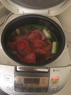 将洋葱、番茄全部加入电饭煲中,选择煲汤模式,时长1小时30分钟。