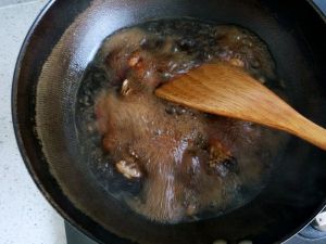大约2分钟后,加1勺黄酒(没有就用料酒),2勺生抽,3勺醋,2勺冰糖(尽量压碎,平勺)