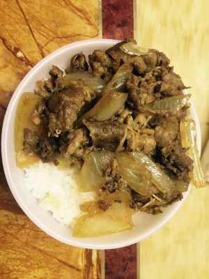 锅中加入少量油,倒入烤肉酱腌制好的肥牛翻炒,肥牛基本变色后放入洋葱同时再倒一些烤肉酱,让味道也能融入到洋葱中,翻炒至肥牛熟就可以了。(注意:肥牛不要翻炒过长时间,否则老了就不好吃了:P) Finish:这样吉野家式肥牛饭就完成啦! 把做好的米饭放到肥牛的旁边,或者把肥牛直接盖到饭上再叫上香香的汤汁~~~ 哇,太美味了~~