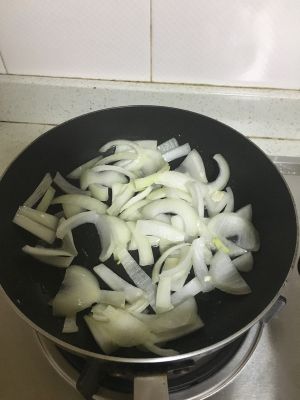 热锅热油下入洋葱丝翻炒出香味且变黄变软。