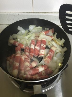 倒入烤肉酱,把肥牛上和葱、姜一起腌制,一定要让烤肉酱和肉充分的融合,腌制20分钟大概。利用这个时间把洋葱焯一下。(这样可以去掉洋葱的辣味,注意:千万别把洋葱给煮烂了,要保持它的硬度,这样才有好的口感。)