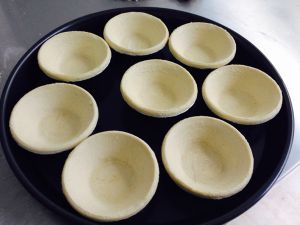将挞水放入挞模中,八分满即可。挞水材料:牛奶80克、淡奶油120克、白砂糖100克、全蛋2个(原配方中是用5个蛋黄,其实用全蛋效果一样好,避免剩下的蛋白不好处理浪费了。)把所有的材料混合在一起,搅拌均均即可。