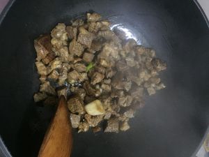 牛肉洗净切成方块,油蒜和姜爆香,放入牛肉爆炒,加料酒生抽,加水炖