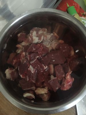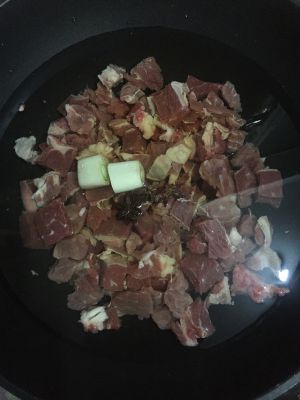 冷锅倒入冷水,下入牛肉块,放去大葱,八角料酒,开盖煮至水沸腾,去掉牛肉的血末,捞出牛肉冲洗干净控水备用