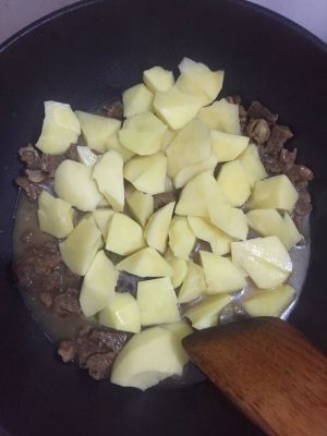 加入土豆翻炒,加水,加一点豆瓣酱,焖炖至肉烂。 不喜欢土豆太烂的可以先加水焖一会肉。