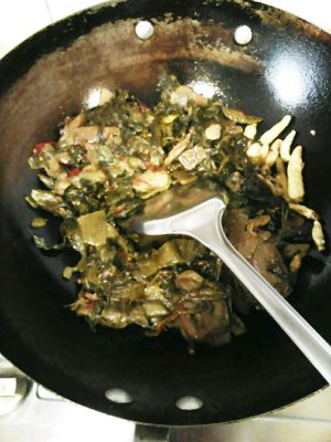 再放油把蒜米爆香,小火放入干辣椒段(炒的时候加少许盐)辣椒出香味后加入酸菜和野山椒