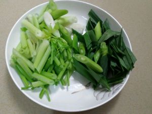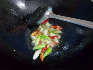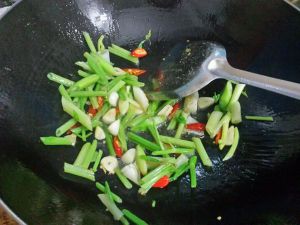 锅入少许油,倒入蒜片辣椒,青蒜蒜白爆香