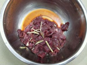 肉片用少许盐,米酒,酱油,姜丝抓拌均匀并按摩至软,这么做是为了口感更嫩,接着放入生粉拌匀,再倒入两匙勺植物油拌匀,腌制20分钟。