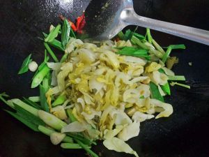 倒入酸菜炒匀,再撒入少许白糖,接着倒入青蒜叶炒两下,最后倒入肉牛炒匀出锅。