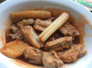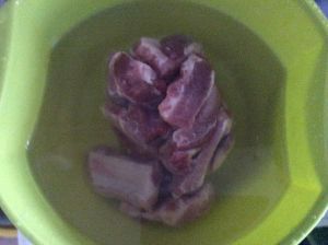 肋排请商家砍成大小合适的段,洗两遍后用清水浸泡1——2个小时,中间最好换两三次水