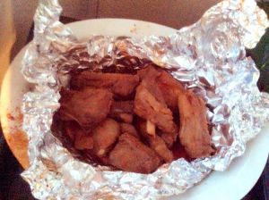 取出烤好的排骨,倒掉里面的汁水,再次刷上上面的调料。这次不需要包严实,敞开就好了,进烤箱再180度烤10——20分钟就好