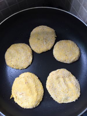 平底锅放少量油,饼子放下,小火煎,两面金黄即可出锅。
