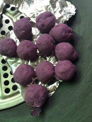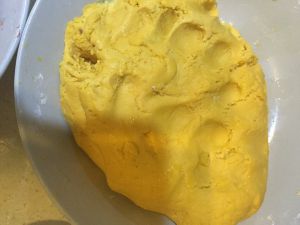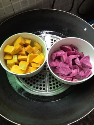 南瓜蒸熟,加入白糖,与糯米粉揉成面团