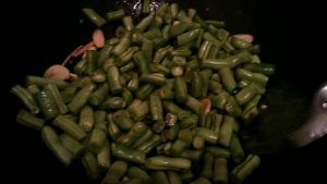 热锅倒油,依次放入姜蒜(喜欢吃辣椒的可以加入辣椒),翻炒几下倒入切好的四季豆,翻炒至变色倒入一些白酒(防止四季豆变黄),加入适量的水盖上锅盖闷炒六七分钟。