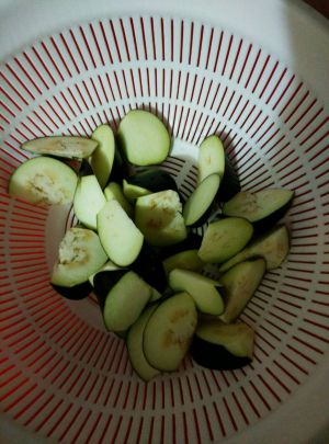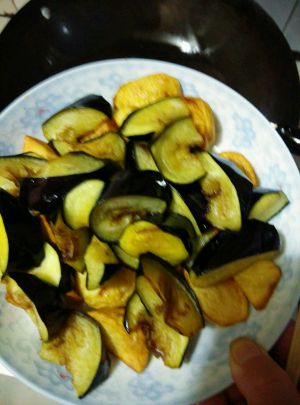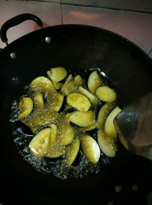 炸完土豆接着把茄子放入油中,同样炸至两面金黄沥干油备用。
