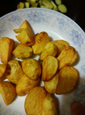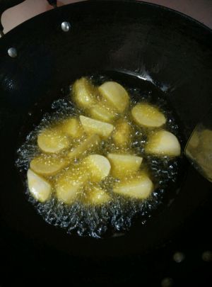 油温8成的时候开始往锅里放土豆,炸至两面金黄沥干油备用。