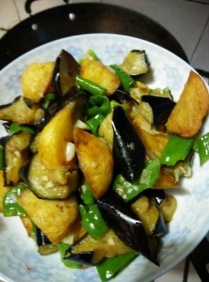 把生抽、蚝油、淀粉、盐、鸡精适量调成勾芡的碗!放入辣椒翻炒、再放入炸好的土豆和茄子,最后勾芡即可!