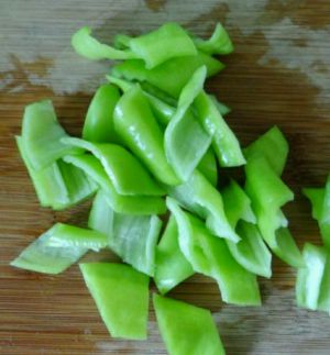 青椒清洗,切成三角块备用。葱、姜、蒜,切好备用