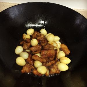 倒入鹌鹑蛋 蒜头 放酱油 料酒 少许糖 翻炒