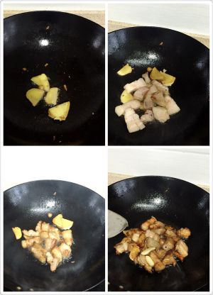 锅中倒油 放姜片煎出香 先把肥一些的倒进去两面煎出油 然后倒入剩下的肉翻炒一会儿