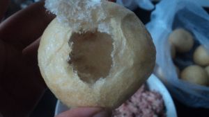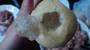 筷子夹一点肉馅,大拇指塞到油面筋里面,一点一点的塞,尽量把肉馅塞得紧一点,塞好肉馅把开的小口的合上