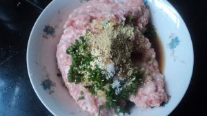 把生姜末、葱花、盐、料酒、糖、鸡精、胡椒粉放到装肉馅的碗中