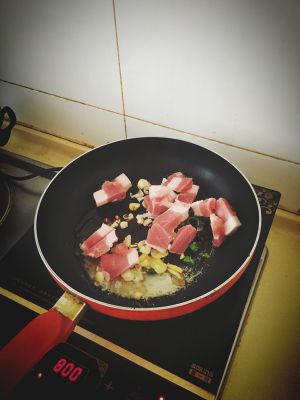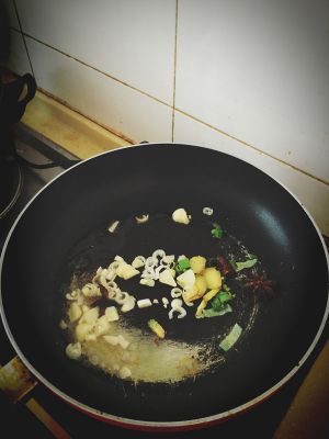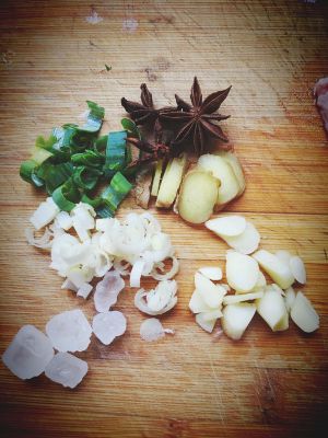 下配料,也可先下五花肉将糖色沾染均匀,我懒得弄,就一起啦,懒癌患者