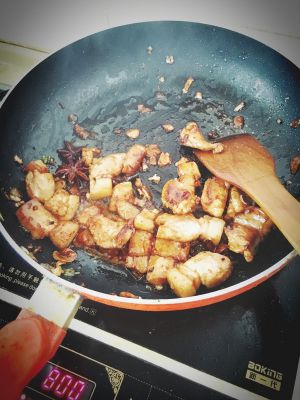 油烧热一点点的时候把糖放入锅内,用勺子不停的搅拌,熬到褐色的时候把肉到锅里、然后把料酒、八角、切好的葱姜、盐、味精、酱油、都到入锅内一起翻炒!都沾到颜色后到入水、再把鸡蛋拨好皮用刀切几道!也放到锅内!