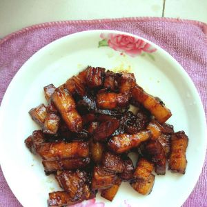 翻炒五花肉五分钟后加料酒再翻炒一下加酱油,炒均匀后,加一些热水,然后大火收汁