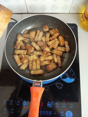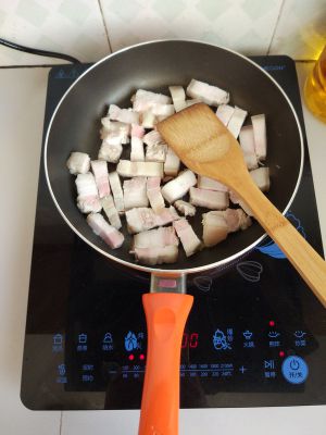 改成大火,倒入五花肉翻炒变色后,改成中火继续煸炒2分钟直到出油。