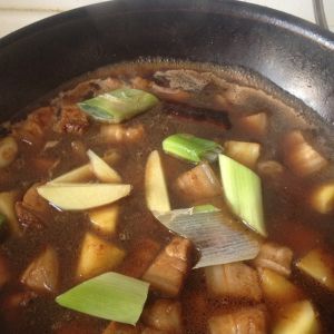 待土豆和五花肉均上色后,加开水至淹没所有食材,加辣椒和葱,如果颜色淡可以加少量老抽调色。