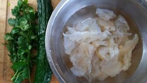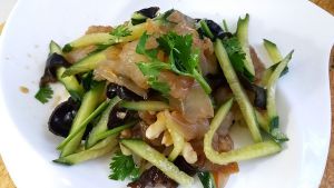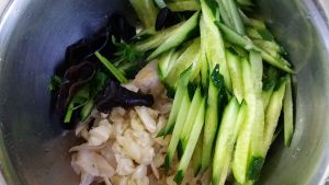 黄瓜切丝、香菜切段、木耳泡发烫一下、再一次添加盐、味精、香油、糖、醋、生抽