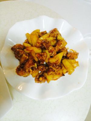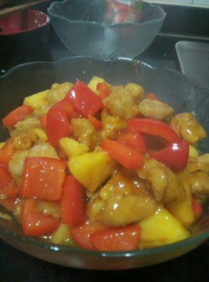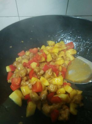 5.锅底放少许油,倒入酱汁,待粘稠时放入肉和菠萝,快速翻炒即可出锅。